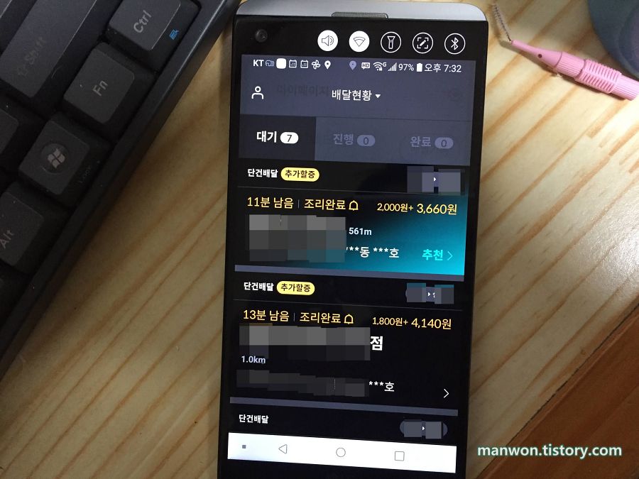 배민원 앱 대기창에 배달콜이 순식간에 7개가 쌓였다. 시간은 저녁 피크 시간대라고 할 수 있는 19시 32분.