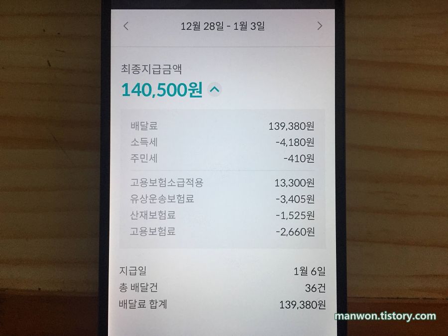 배달 개수: 36건 (배달 1건당 실수령액 3,902원)