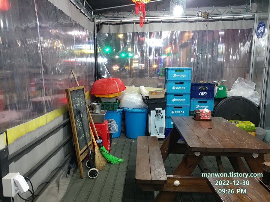 음식점 실내는 일반 건물 내 상가이고 내가 찍은 곳의 그 밖에 위치한 일종의 테라스다. 저런 포장마차 같은 분위기에서 친구들과 술 마시면서 담배 피우고 떠들던 때가 기억난다.