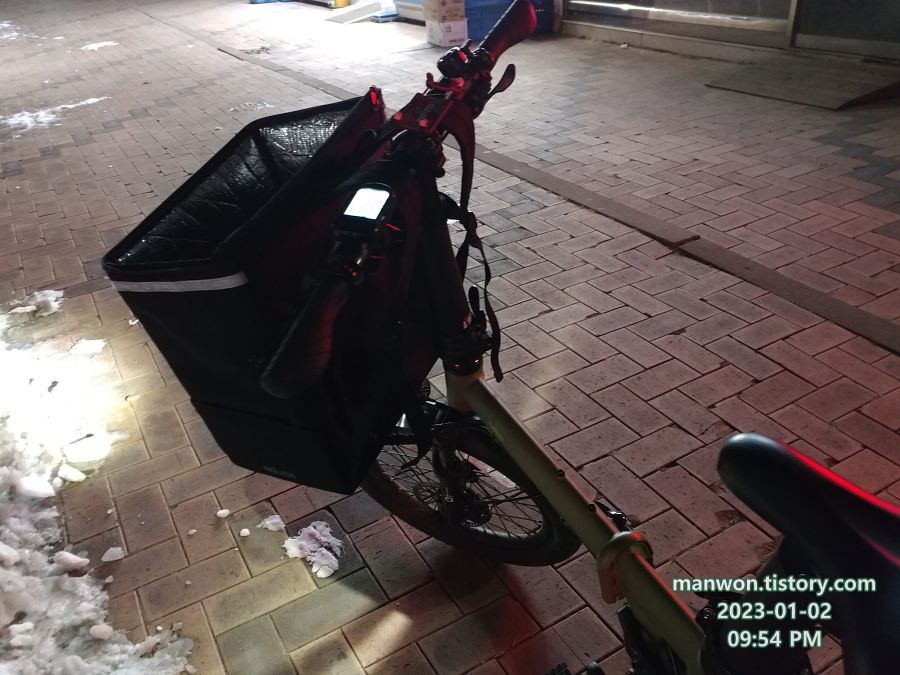 - 자전거 주행 중 배달통이 땅바닥에 떨어짐. (케이블타이가 벌써 2번 끊어짐)