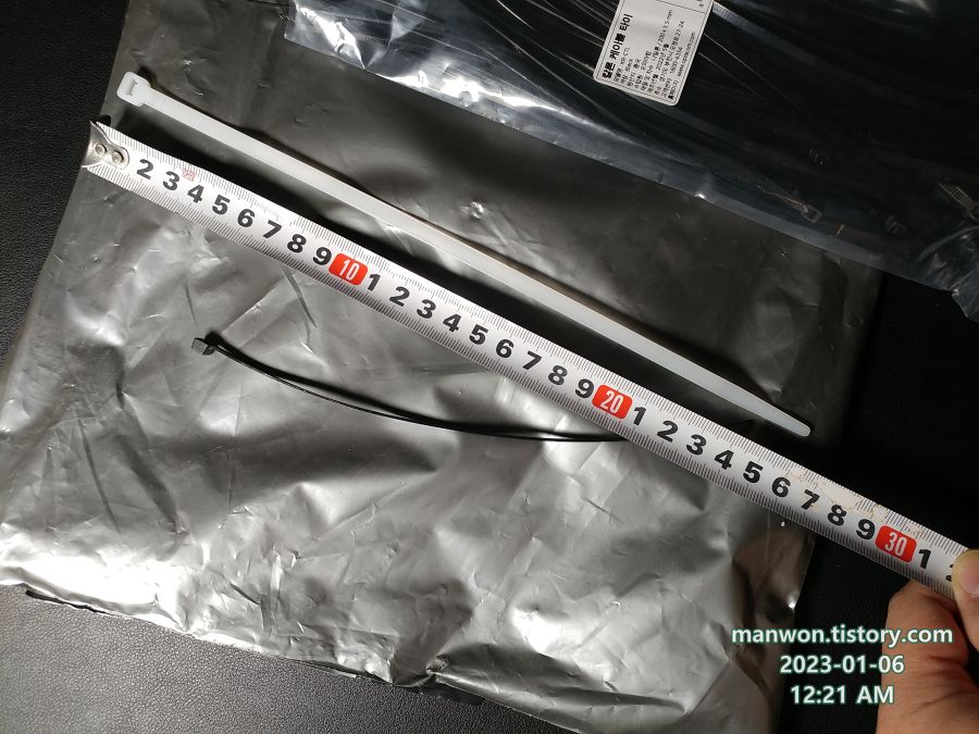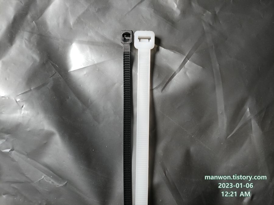 - 오른쪽: 국산 케이블 타이. 길이 270mm, 폭 6.1mm.
