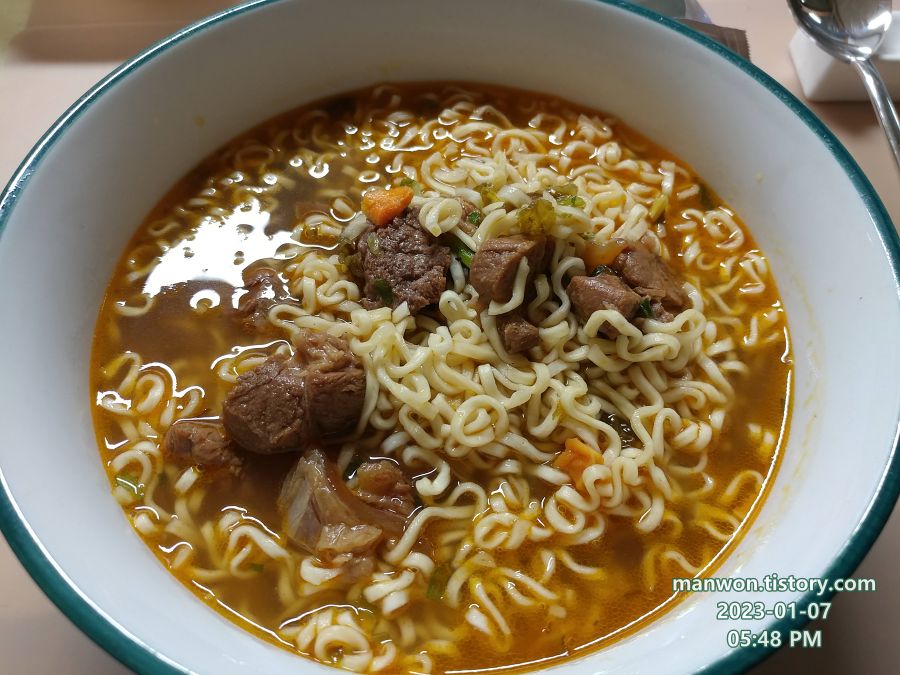 김치찌개에 넣은 고기를 몇 개 건져서 라면 끓일 때 다시 넣었더니 위 사진처럼 먹음직스러운 라면이 됐다.