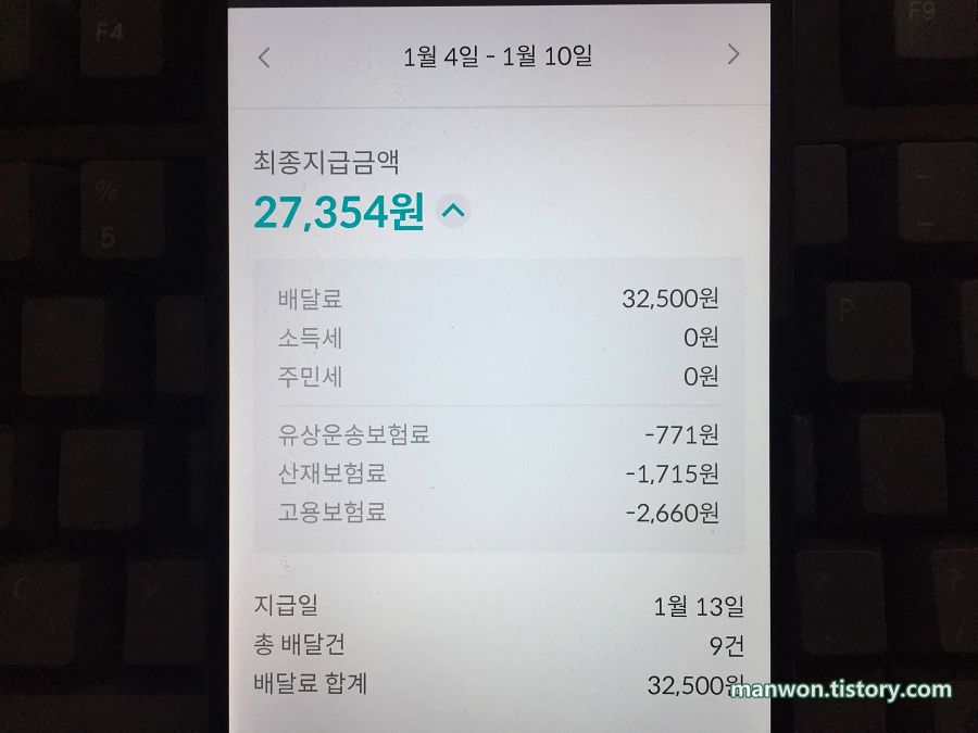 배달 개수: 9건 (배달 1건당 실수령액 3,039원)