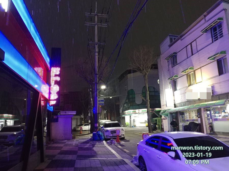 저녁 7시경, 구 시가지 모텔 배달 건인데 갑자기 눈이 오기 시작한다. 적당히 오다가 그치겠지 생각하며 배달을 계속했는데...