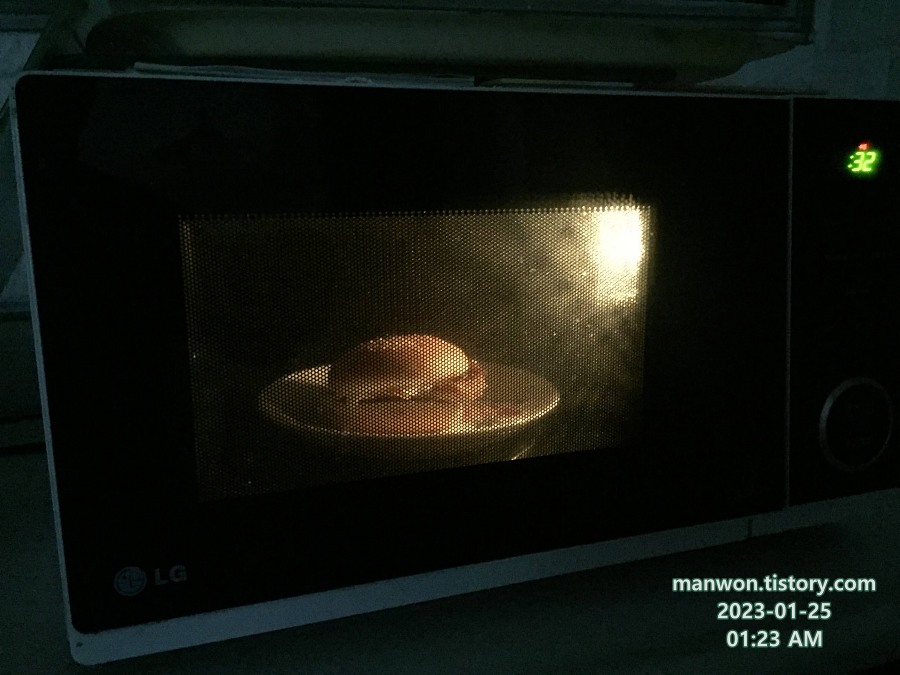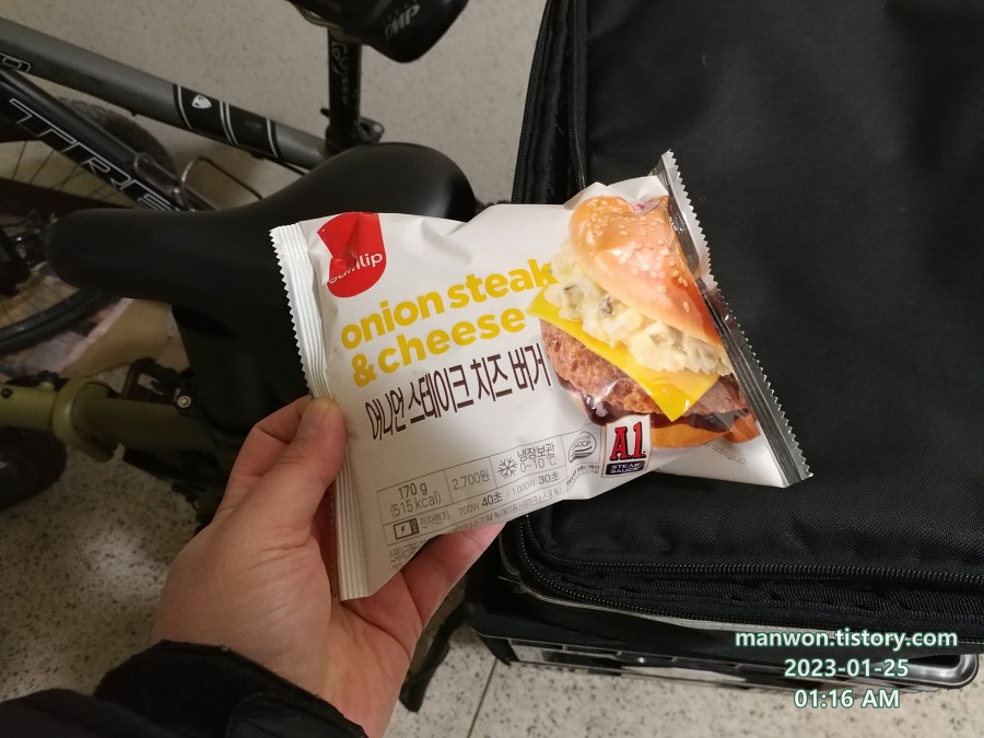 편의점에서 구매한 어니언 스테이크 치즈 햄버거를 전자레인지에 돌린다.