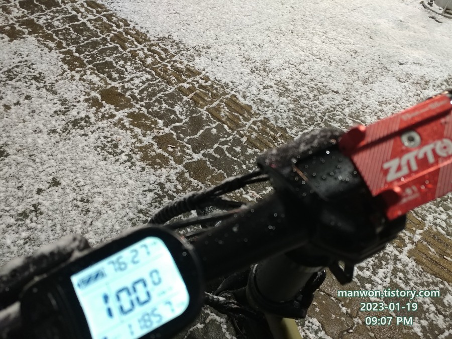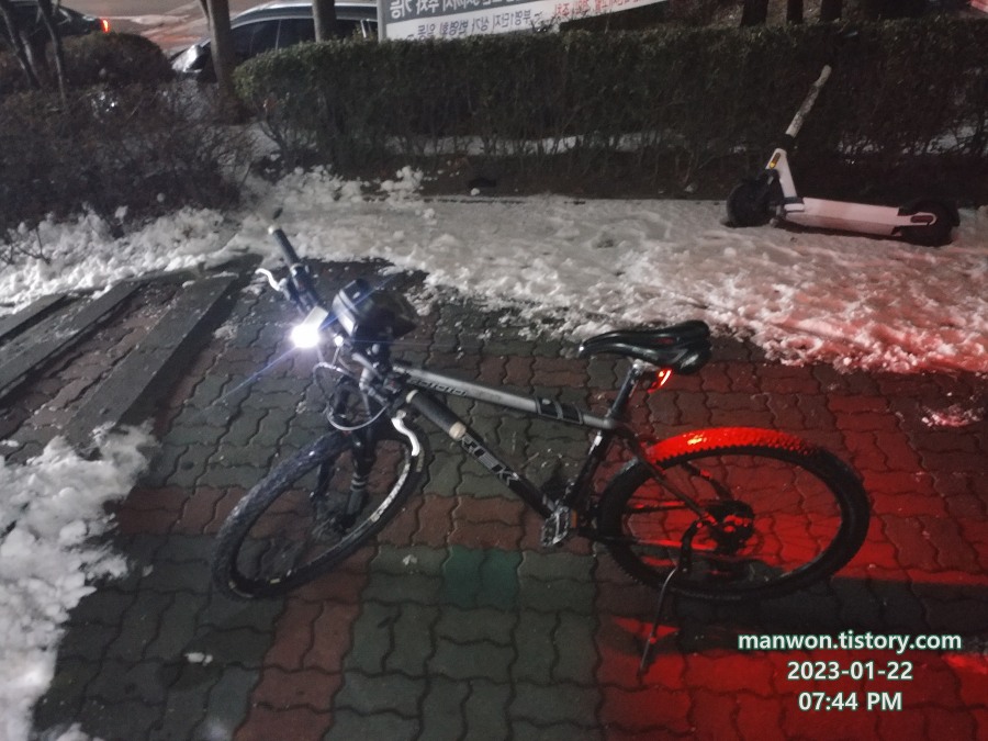 공중 화장실에서 몸을 녹이며 찍은 자전거 사진. 날씨가 추워서 배터리도 빨리 닳는다.