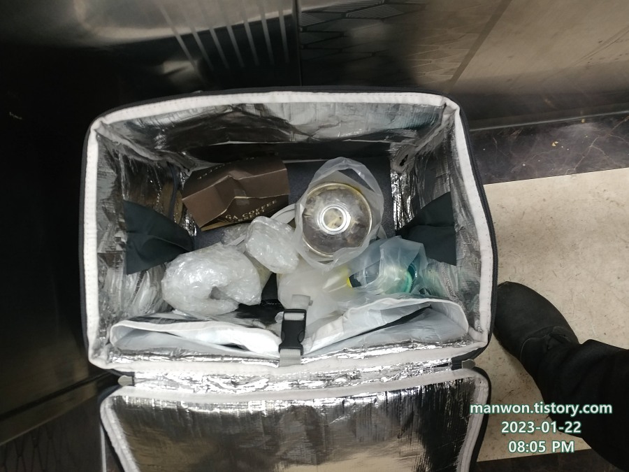 이럴 때는 위 사진처럼 가방에 수평을 맞춰 잘 넣은 후 배민원 가방 내부에 있는 끈과 뽁뽁이를 잘 사용하면 무탈하게 배달할 수 있다.