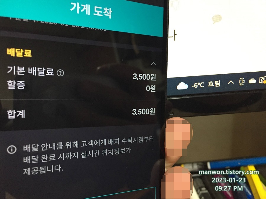 2023년 1월 23일 월요일. 저녁 9시 27분. 현재 영하 6도인데 이 정도 추위로는 기상 할증이 붙지 않는다.