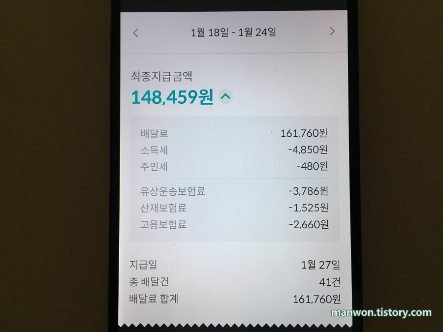 배달 개수: 41건 (배달 1건당 실수령액 약 3,621원)