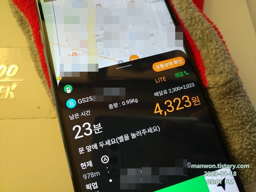 추운 날씨라 GS25 편의점 배달료가 2,023원 할증되었다. 그래서 0.95kg의 매우 가벼운 무게의 배달건이 무려 4,323원!