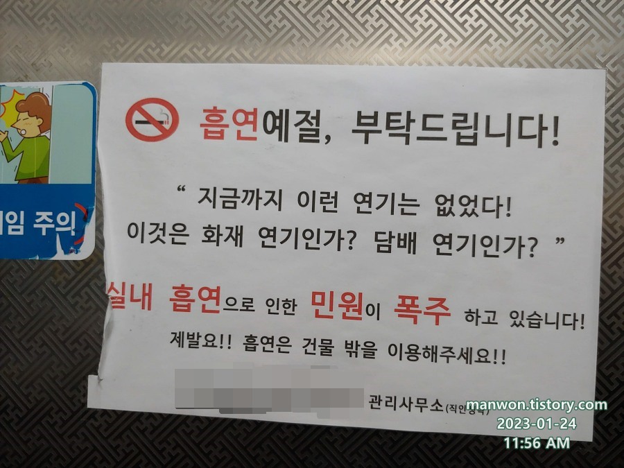 요새나 아파트나 빌라 엘리베이터에 이렇게 흡연예절과 관련된 안내문이 붙어 있는 곳이 꽤 많다. 멘트가 꽤 재밌어서 찍은 사진.