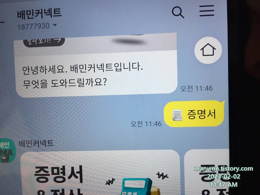 원천징수영수증이 필요했는데 배민의 경우 그 발급이 매우 편했다. 위 사진처럼 배민커넥트 카카오 채널 채팅방에서 '증명서'를 선택한 후...