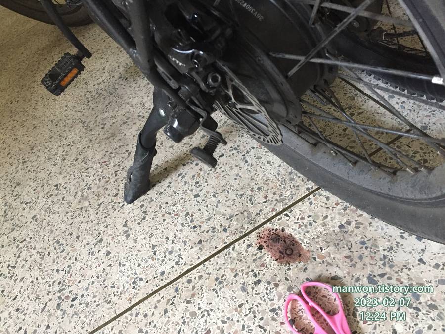 새 패드가 캘리퍼 속으로 잘 들어가지 않아서 혹시나 하는 마음에 브레이크 레버를 살짝 당겼다. 그랬더니 위 사진처럼 정체불명의 액체가 주룩주룩 새기 시작했다.