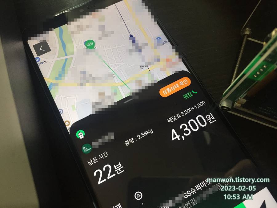 우딜 GS슈퍼 배달 건인데 무게도 가볍고 배달비가 무려 4,300원이다. 아마도 일요일이라 1,000원을 더 얹어준 것 같다. 우딜 GS슈퍼 배달 건이 가끔 부피가 매우 크고 무거운 배달이 있어서 그렇지, 그런 것만 제외하면 우딜 배달도 꽤 편하고 짭짤한 편이다.