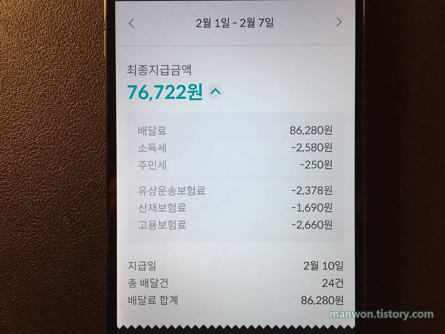 배민원 배달료 실수령액: 76,722원