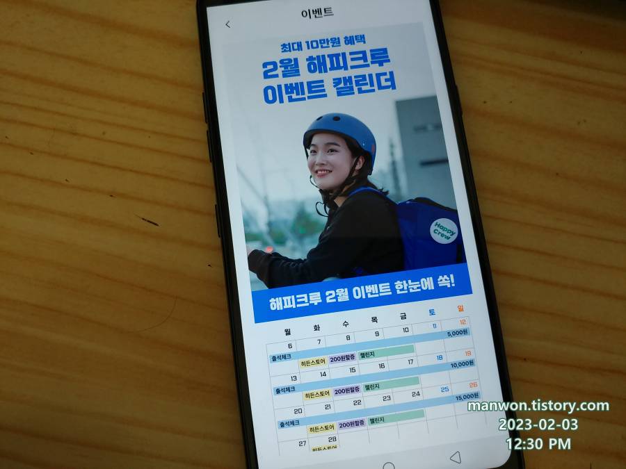2월 해피크루 이벤트 공지가 떴다. 21일 동안 1일 1건 이상 수행 시 최대 3만 원을 받을 수 있고, 수요일에는 배달 건당 200원을 더 준다고 한다.